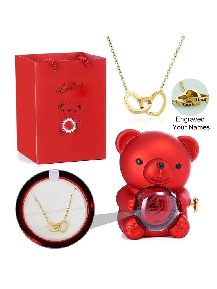 Expertly crafted by the NoEnName_Null brand in Fujian, this exquisite double heart necklace comes with a rotating bear eternal rose jewelry box, making it the perfect gift for special occasions such as weddings, engagements, christenings, St. Patrick's Day, retirement parties, gender reveal events, birthday celebrations, house moving, Children's Day, April Fool's Day, back-to-school season, Chinese New Year, Earth Day, Father's Day, Thanksgiving, parties, Christmas, Valentine's Day, Halloween, Easter, New Year, graduations, anniversaries, and Mother's Day. Made from high-quality plastic and customizable with your choice of name, this necklace is designed to impress. Simply provide us with the name you would like to personalize, and we will make sure it's beautifully engraved on the necklace. The necklace can accommodate up to two names at once. The bear rotating rose jewelry box is available in a variety of vibrant colors, including red, purple, green, pink