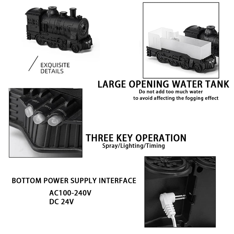 ● Product Specifications: Name: Little Train Aromatherapy Humidifier Voltage: AC100-240V, 50/60HZ:DC 5V Material: PP/ABS Content: 300ml Color: Black, White, Green, Bronze, Antique Silver Dimensions: 240*83* 138mm Note: Due to the unique monitor and lighting features, the actual color of the item may slightly vary from the color displayed in the pictures. Thank you for understanding! Please allow for a 1-2cm measurement deviation due to manual measurement.
